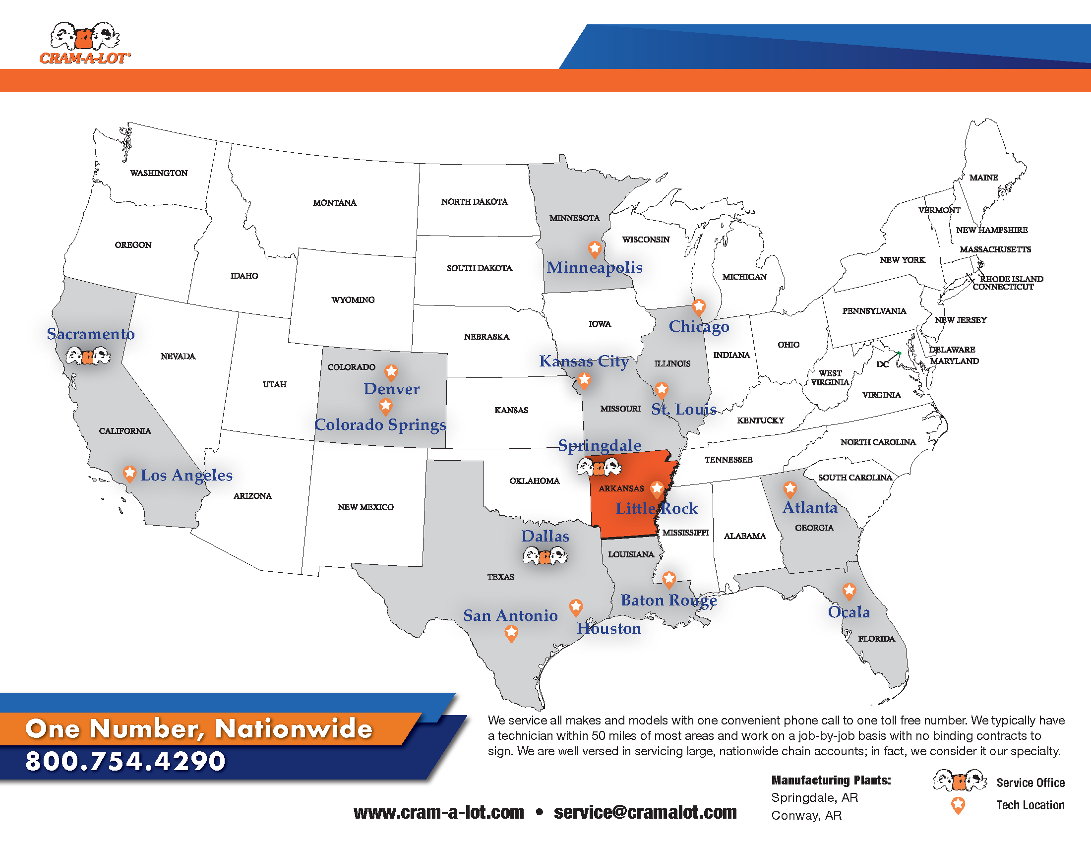 We will coordinate the freight and delivery for your new Cram-A-Lot equipment from our factory, or we can relocate your existing equipment to a new site. We can arrange freight to all 50 states and Canada, and can arrange ocean freight for international shipments.